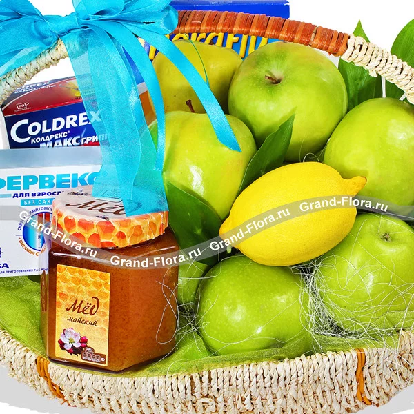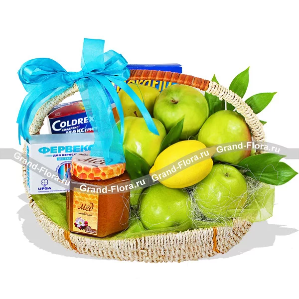 Уменьшеный: яблоки - 0.5 кг, лимон - 1 шт, мед(500 г.) - 1 шт., Coldrex МАКС Грипп - 1уп., ТераФлю - 1 уп., корзина малая, декор.