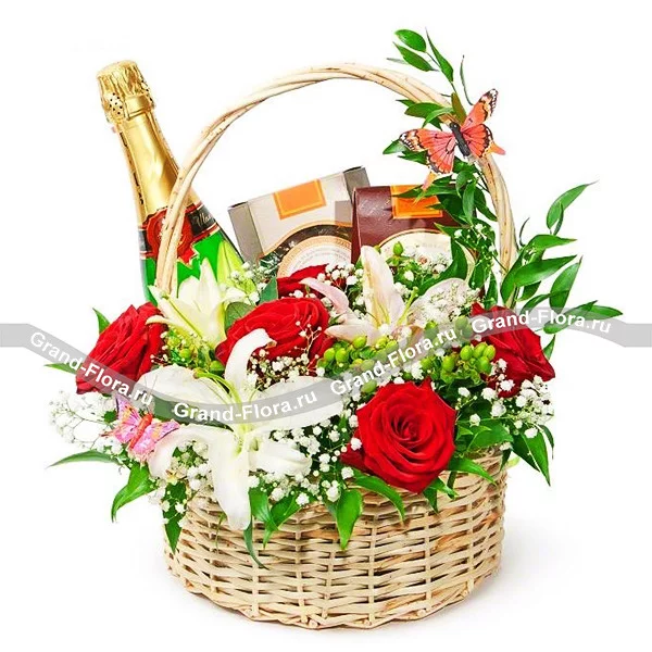 Преподнести такую очаровательную корзину в подарок – значит сделать человека чуточку счастливее. В ней все гармонично: страстные розы и нежные лилии своим ароматом прекрасно дополняют сочетание пьянящего шампанского и нежнейшего шоколада. Это ли не ощущение счастья?